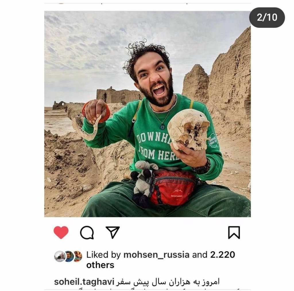On Instagram, Soheil Taghavi describes himself as a tour guide. He has 29,000 followers. In the videos that he posted of his visit to the Tasuki archeological site, Taghavi digs in the ground and pulls out skulls and bones, then poses with them in front of the camera.