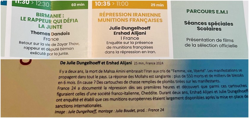 I am thrilled to announce that “Repression in Iran, Ammunition Made in France“, the investigation I conducted with my esteemed colleague Julie Dungelhoef, has been selected for the 32nd FIGRA Festival in the documentary competition (under 40 minutes). This two-year investigation uncovered how French-made shotgun shells ended up in Iran and were used against Woman, Life, Freedom protesters—despite international sanctions. Shedding light on this injustice would not have been possible without the courage of Iranians who sent us hundreds of photos and the bravery of Elaheh and Sima, two victims of shotgun fire, who shared their harrowing experiences.